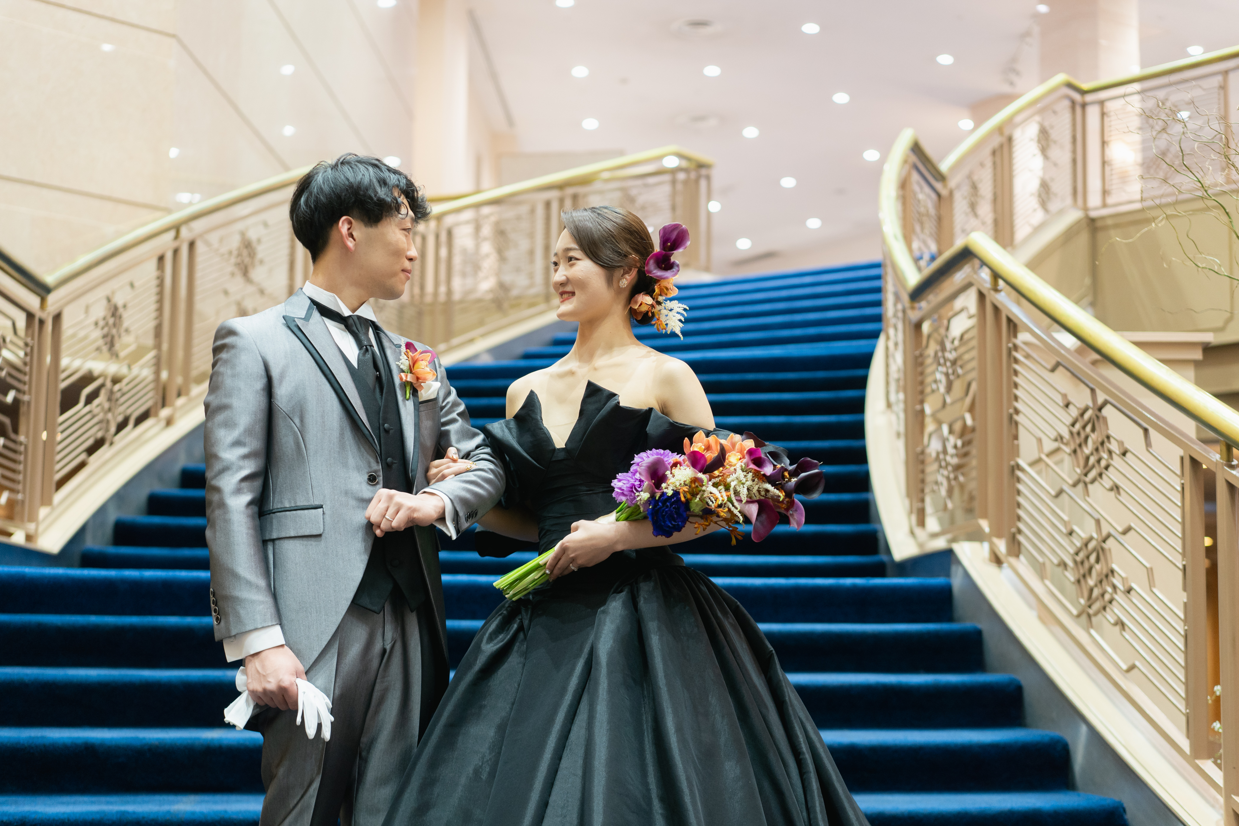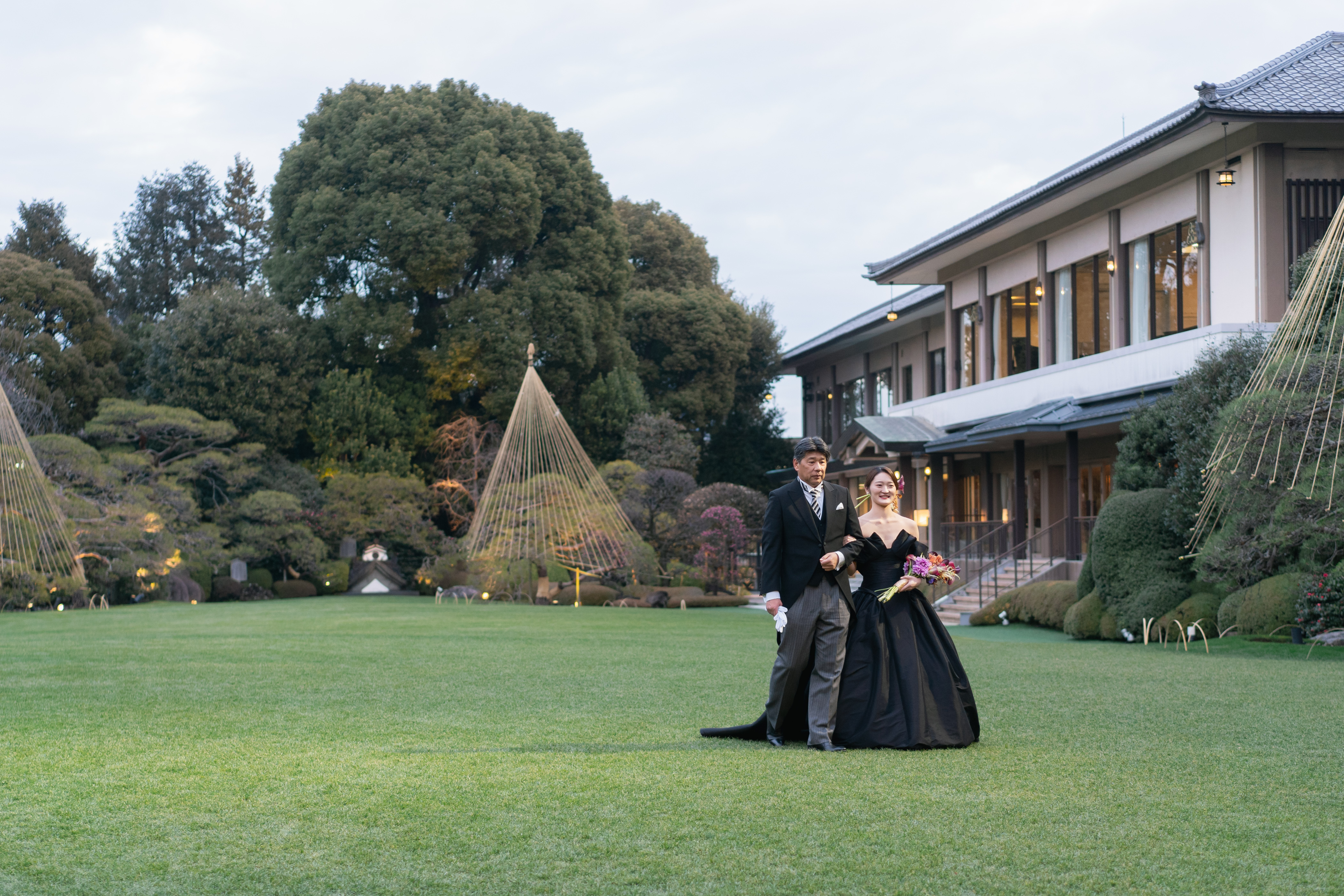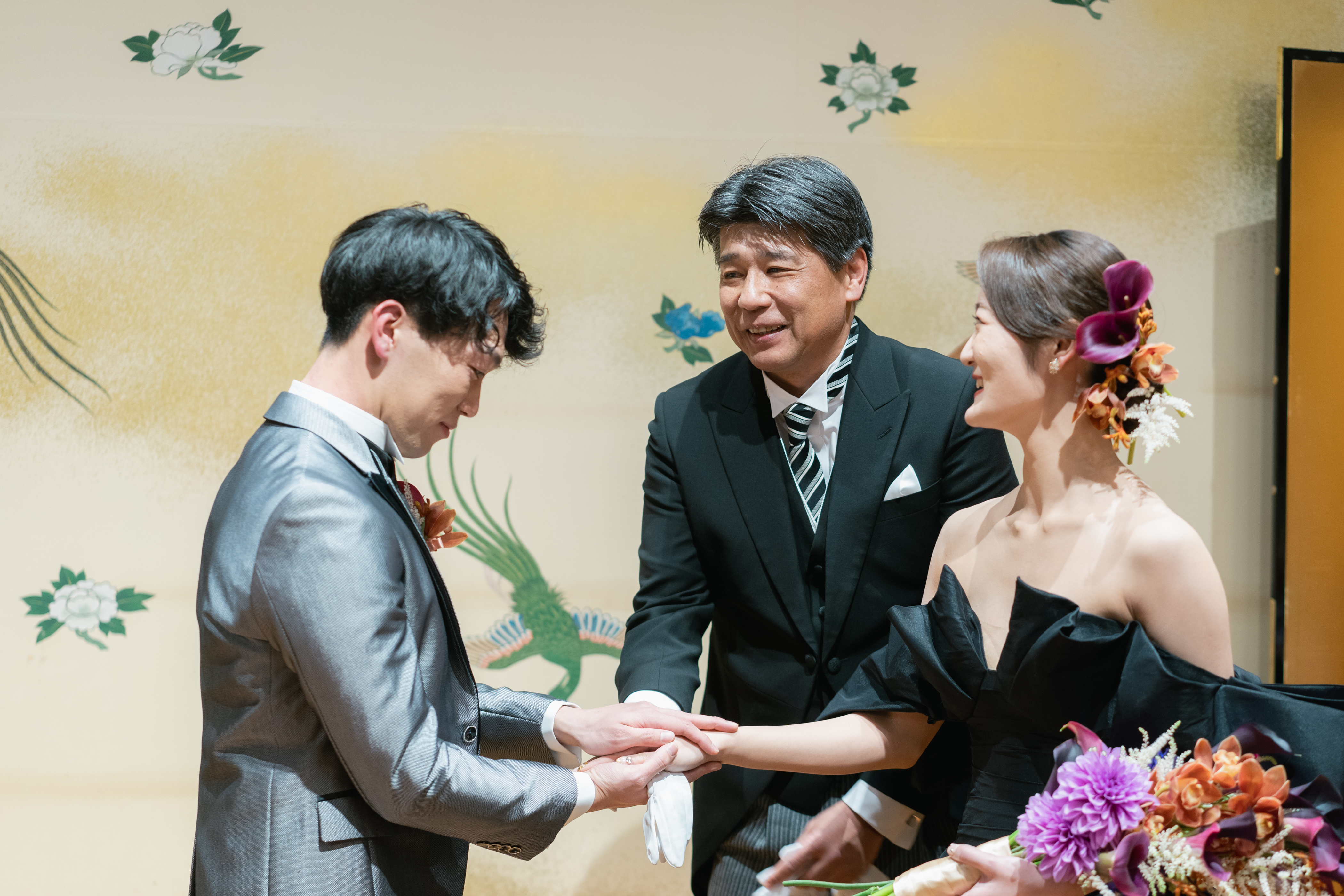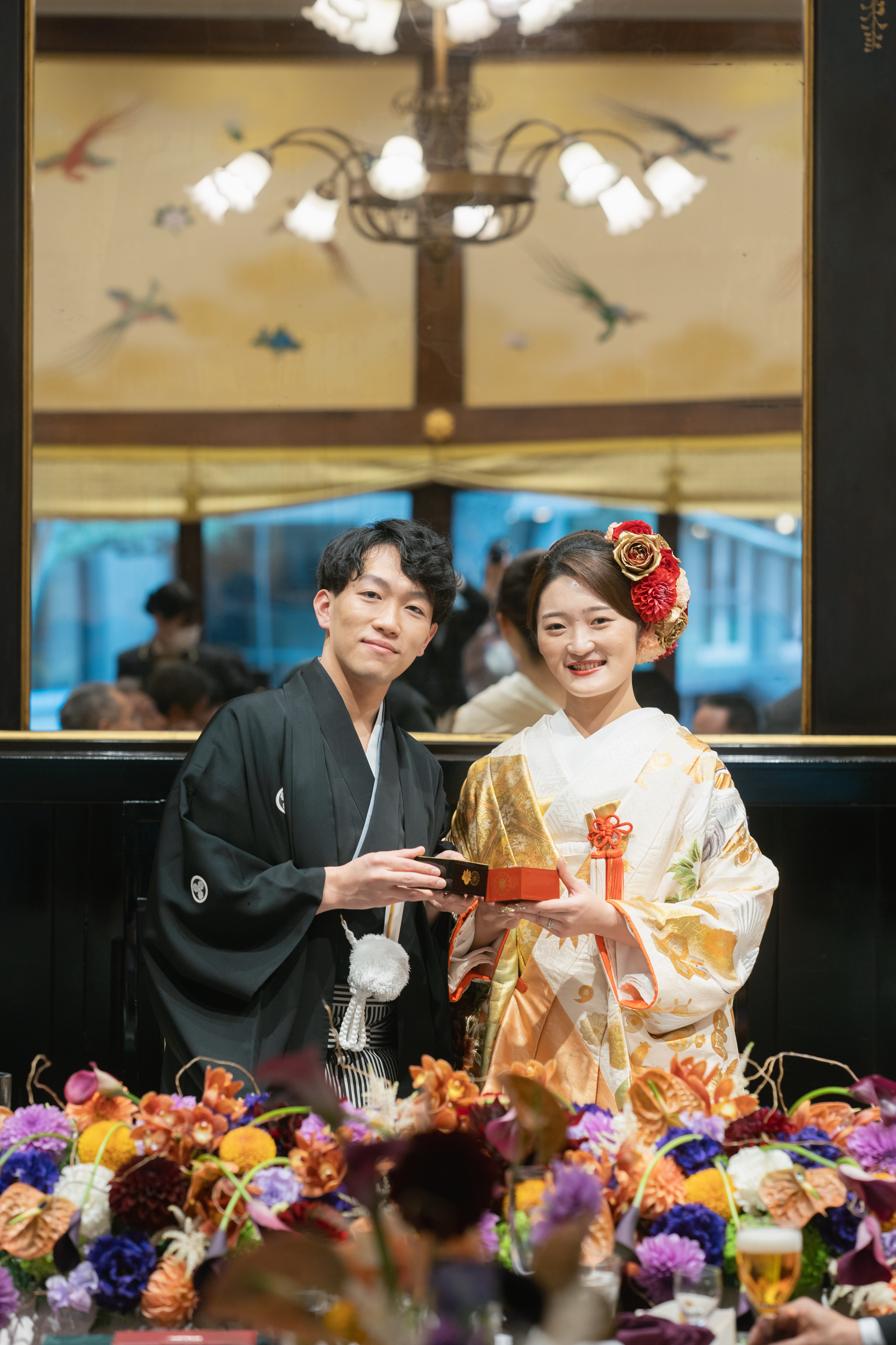 新郎は幼い頃から剣道に携わり、新婦の両親から神社で和装を着て欲しいとの熱望を受け、迷うことなく和婚を選んだ。会場は写真で見た「明治記念館」の「金鶏」に一目惚れ。豪華な金の壁紙や、会場の外に広がる庭園はまさに理想の空間で、両親への感謝の気持ちを込めて、格式高いこの会場に決めた。招待状も「金鶏」の壁を飾る柄のものに。衣裳は新郎祖母のアドバイスで選んだ洗練された色打掛。人と被らず印象的にとオーダーした生花の髪飾りも、花嫁を艶やかに輝かせた。お色直しではバージンロードを歩むシーンを再入場で実現。新婦父から新郎へ新婦の手を託す瞬間、新婦のこぼれる涙に会場が大きな感動に包まれた。黒ドレスは「あなた以外に染まりません」の意に惹かれて決定。濃い花色のブーケもクールな大人の花嫁を演出した。またブーケと同じ花を使った装花は、「金鶏」の雰囲気にもマッチ。空間、生花、和装、ドレスが融合し最高に美しい結婚式となった。