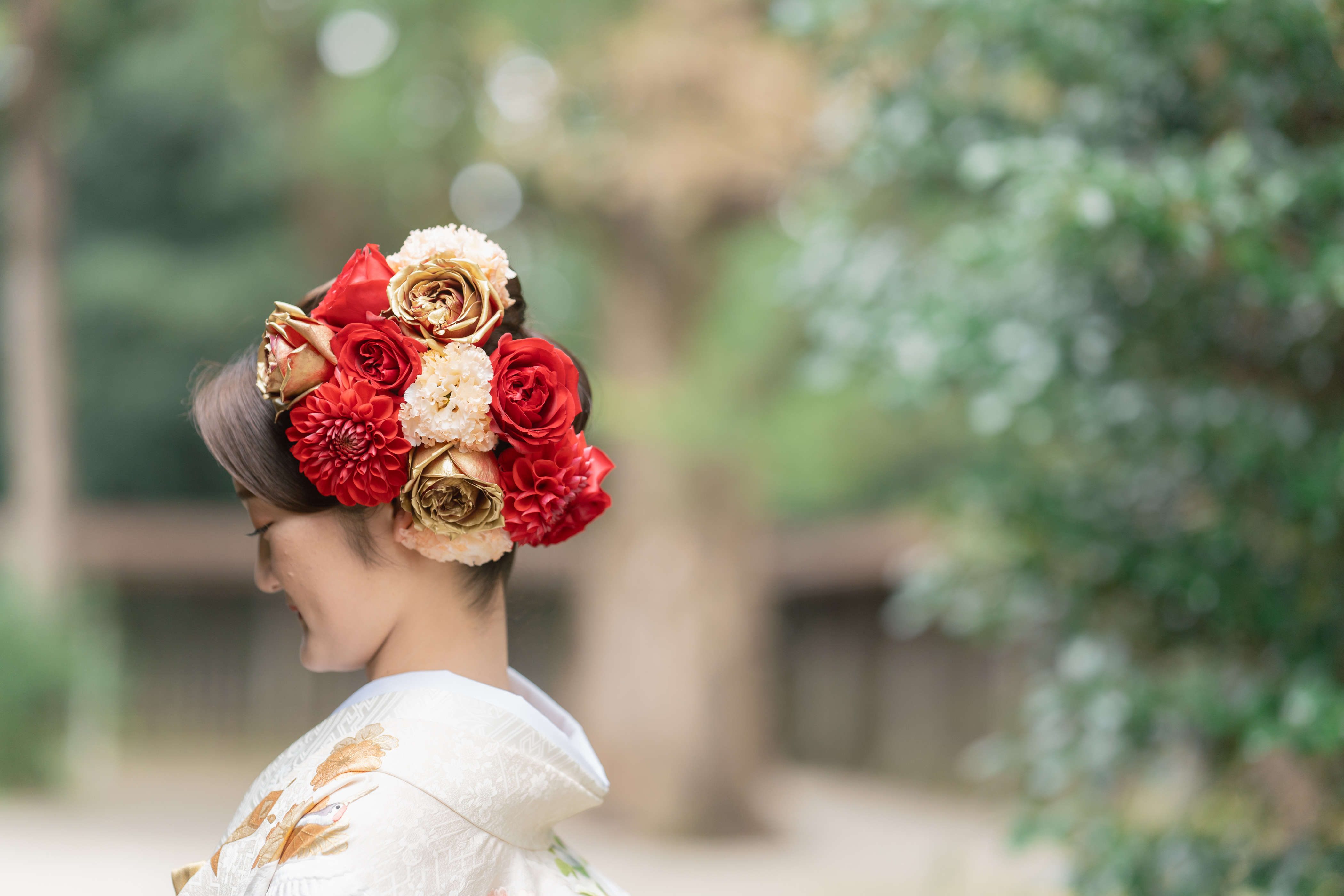 赤バラを金に染めた新婦こだわりのヘアアレンジ