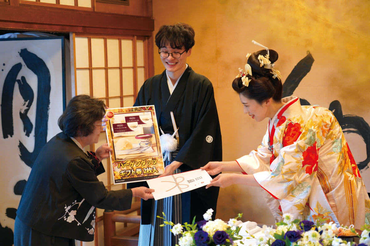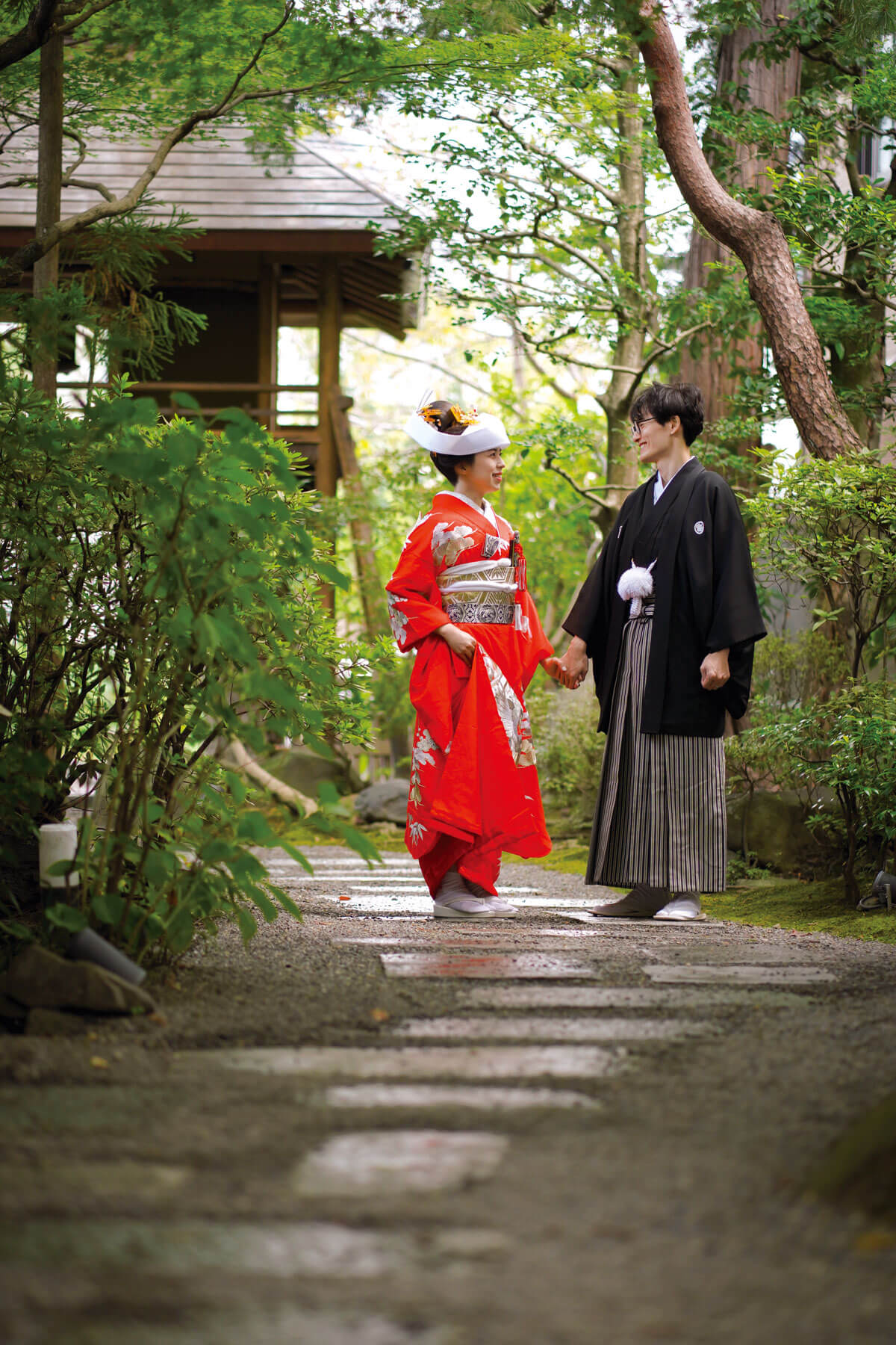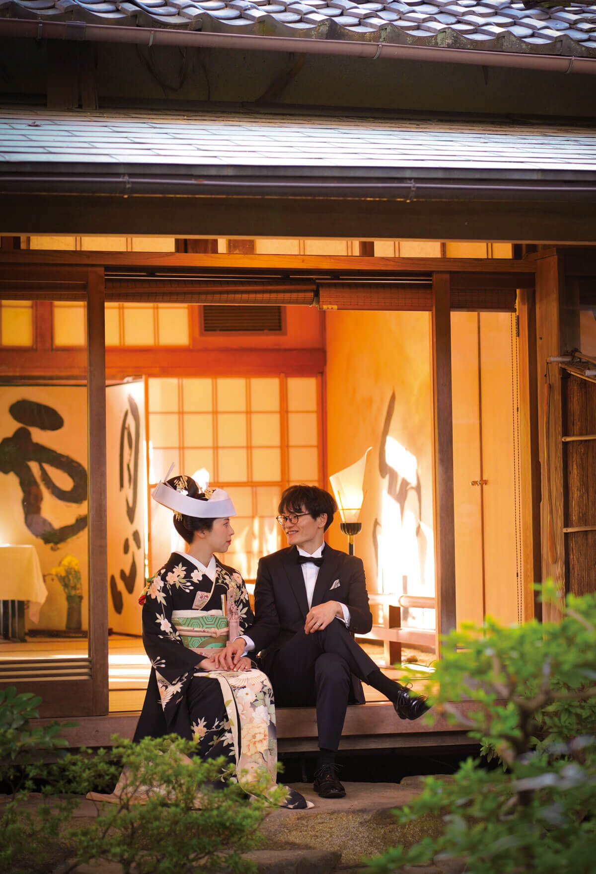 披露宴は野趣溢れる日本庭園を臨む老舗料亭へ。ゆったりと寛げるお座敷は、高齢のゲストや小さなお子さんのいるゲストからも大好評。落ち着いた上質空間で、匠の技が光る至福の料理を堪能し、みんなの笑顔がこぼれる思い出深いひとときに。伝統ある神社や料亭での結婚式は、人生の節目にまた訪れることのできる、家族の大切な場所となった。