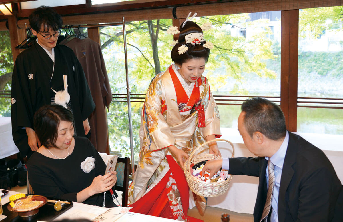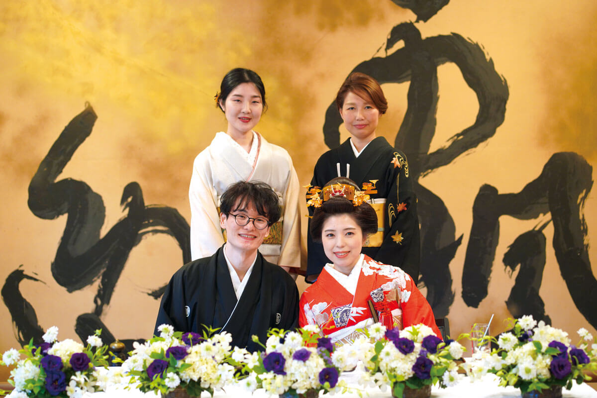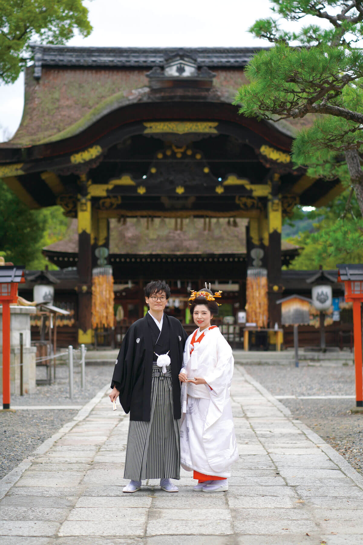 結婚式はふたりが出会った場所であり、思い出の詰まった京都に。両親も楽しみにしているのが伝わり、アットホームな家族婚を準備した。新婦がこだわったのは花嫁衣裳。成人式で母の振袖を着た際、祖母に「打掛けもあるのよ」と目にした衣裳の感動が忘れられずにいたという。そんな強い思いに新郎も賛同し、母の衣裳で結婚式を挙げる新婦の夢を叶えた。ふたりが挙式の場所に選んだ豊国神社は、壁のない半屋外の神殿。四方が美しい緑に囲まれる神聖な空間は、一般参拝客が入れない特別な場所であることも決め手となった。