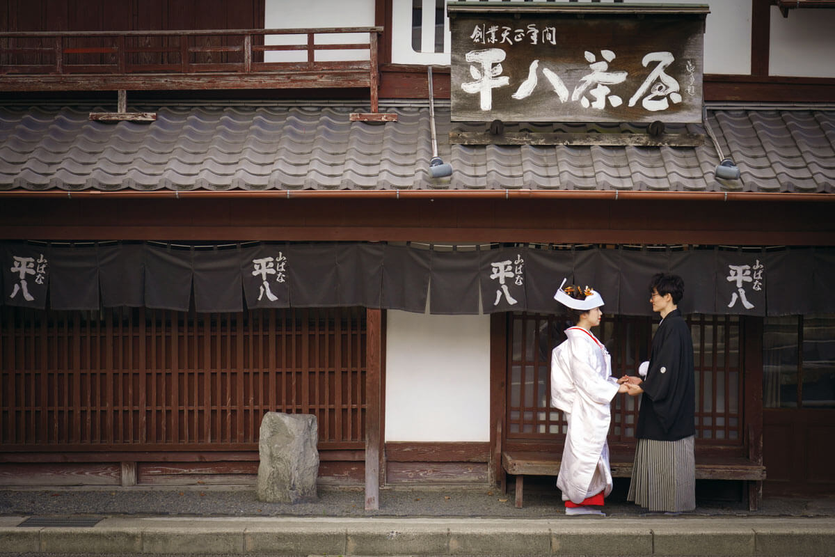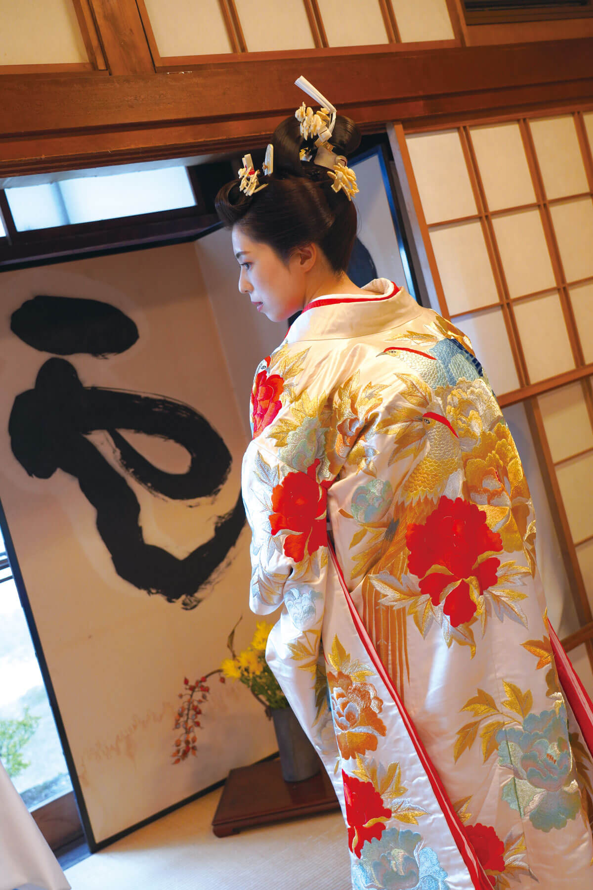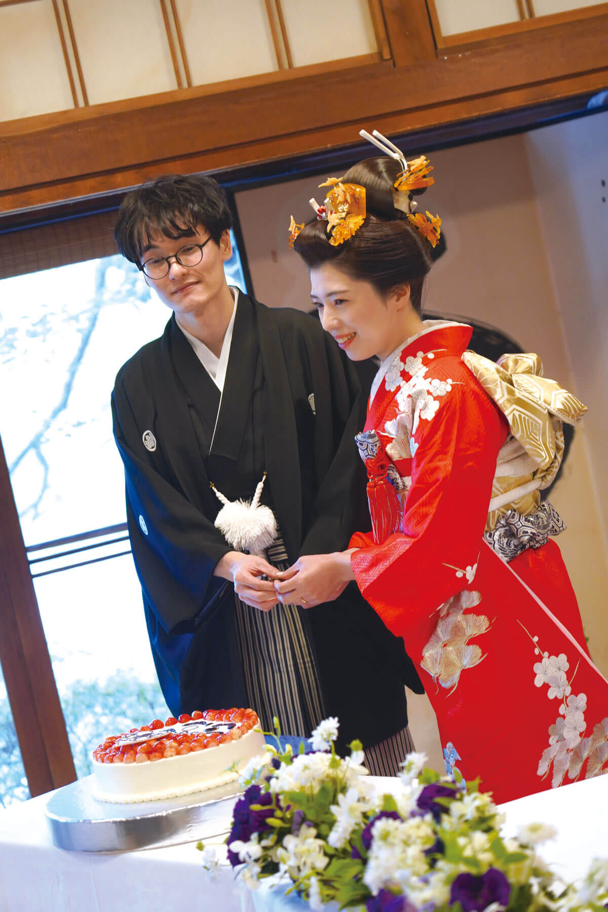 結婚式はふたりが出会った場所であり、思い出の詰まった京都に。両親も楽しみにしているのが伝わり、アットホームな家族婚を準備した。新婦がこだわったのは花嫁衣裳。成人式で母の振袖を着た際、祖母に「打掛けもあるのよ」と目にした衣裳の感動が忘れられずにいたという。そんな強い思いに新郎も賛同し、母の衣裳で結婚式を挙げる新婦の夢を叶えた。ふたりが挙式の場所に選んだ豊国神社は、壁のない半屋外の神殿。四方が美しい緑に囲まれる神聖な空間は、一般参拝客が入れない特別な場所であることも決め手となった。