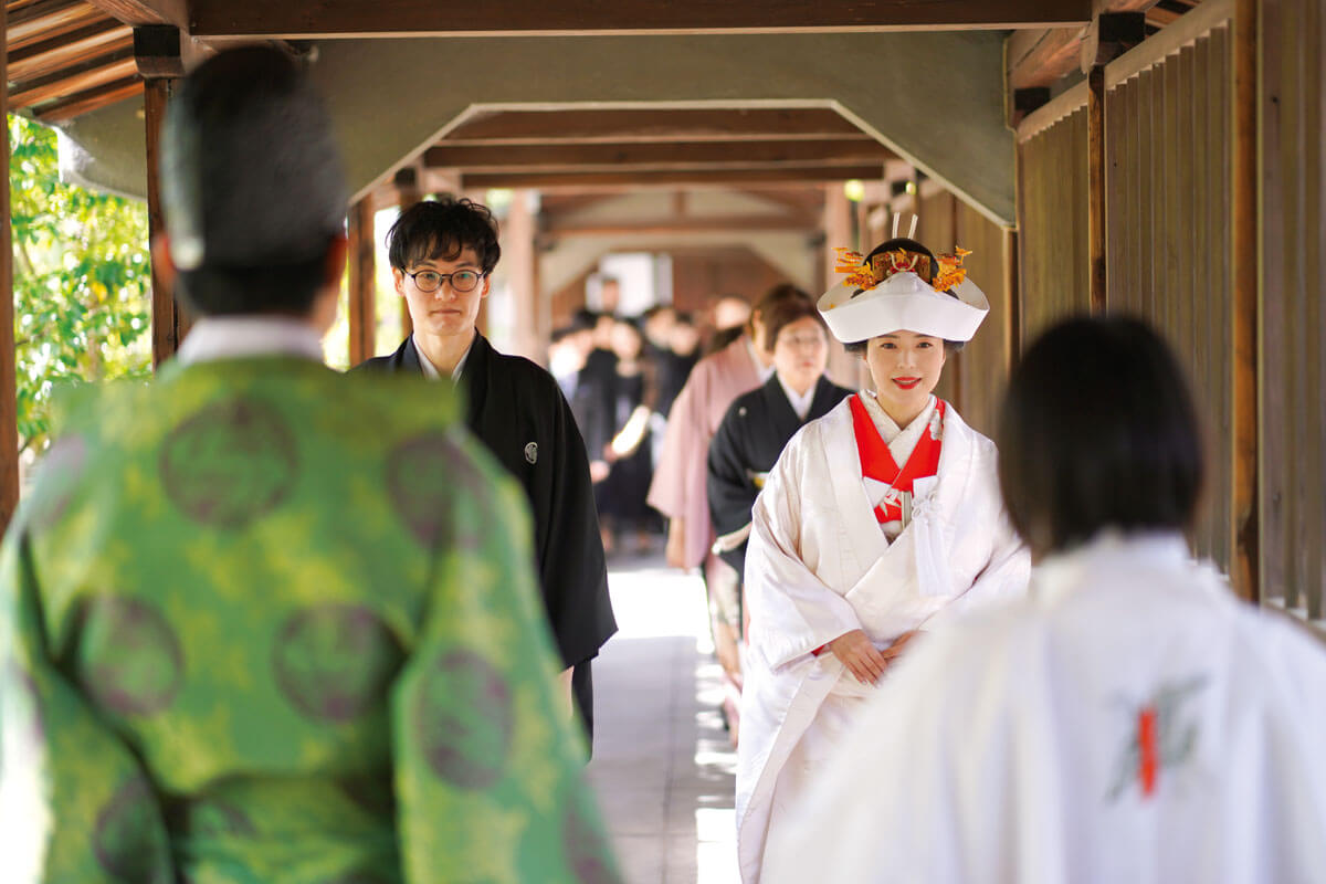 神殿へ厳かに向かう参進。白無垢から覗く朱色が華やか